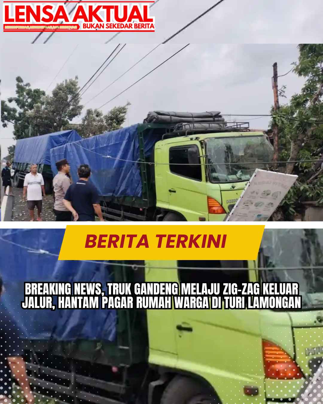 Peristiwa tersebut melibatkan sebuah truk gandeng bernomor polisi S 9194 UB yang dikemudikan Suwartono (70) warga Sukorejo, Bojonegoro, Jatim.